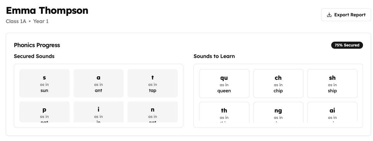 Hearo instantly generates phonics reports showing which sounds each child has secured and which need further practice. Reports can be saved or printed. Ideal for tracking progress and sharing with families.